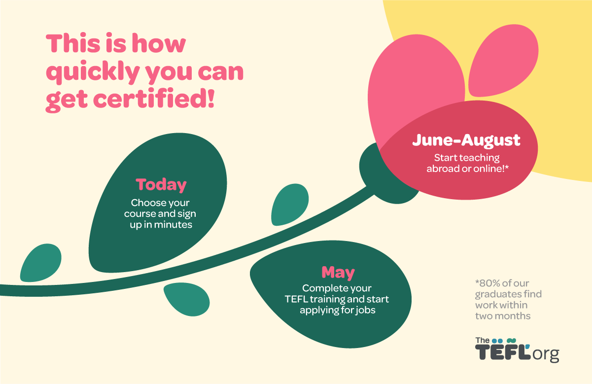 Sign up for a course today and get qualified in just 4-6 weeks. 80% of our graduates find work within two months, so you could be in your first teaching role abroad or online by this summer!