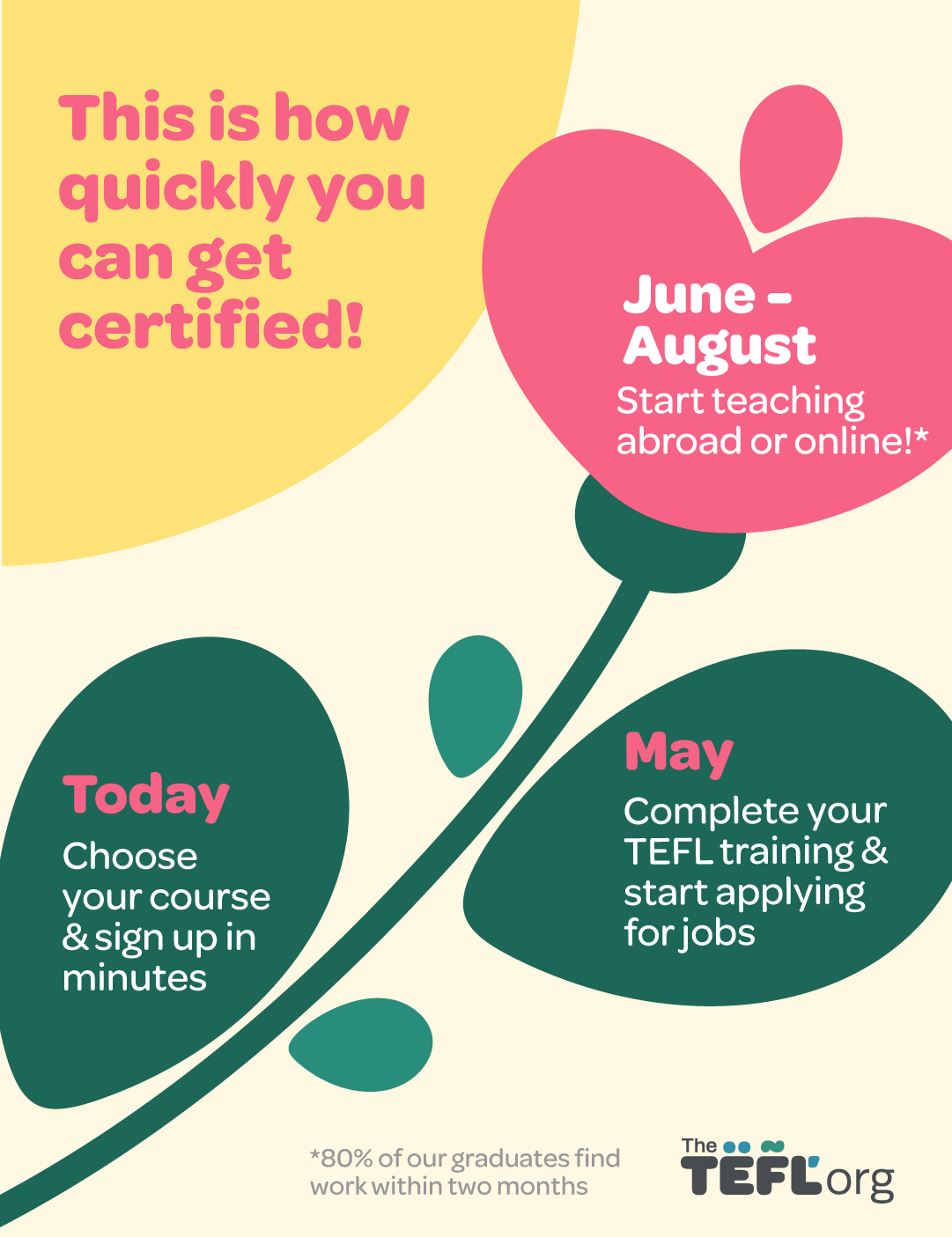 The TEFL Org needs the contact information you provide to us to contact you about our products and services. You may unsubscribe from these communications at any time. For information on how to unsubscribe, as well as our privacy practices and commitment to protecting your privacy, please review our Privacy Policy.